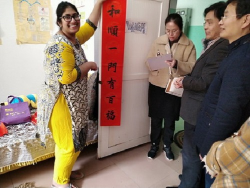 杨耀防来到留学生宿舍,学生们都很高兴。杨耀防与留学生们亲切交谈,询问他们的假期计划,叮嘱他们注意人身安全,在宿舍不要使用危险电器,保持宿舍清洁卫生,利用寒假学习汉语和医学专业知识,并与家人保持密切联系。有些学生宿舍贴上了春联,杨耀防用英语为学生们解释春联的意思,祝福他们节日快乐,希望他们在中国欢度春节的同时,了解中国春节的习俗。