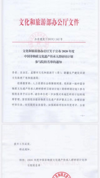 近日,文化和旅游部办公厅下发了《关于公布2020年度中国非物质文化遗产传承人群研培计划参与院校名单》文件中获悉,我校由副校长查振华主持的《青阳腔培训》项目位列其中。