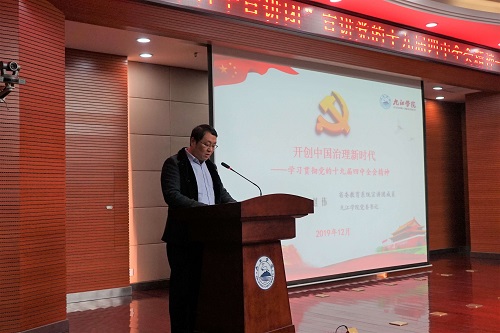为进一步推动我校学习贯彻党的十九届四中全会精神走深走实,帮助师生全面理解和深入领会全会精神,12月18日,全省教育系统宣讲团成员、校党委书记赵伟在逸夫图书馆报告厅为会计学院师生作了题为《开创中国治理新时代——学习贯彻党的十九届四中全会精神》的宣讲报告。报告会由会计学院党委书记吴铃主持。校党委委员冯健和会计学院师生代表200余人聆听了报告。