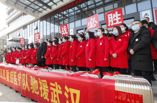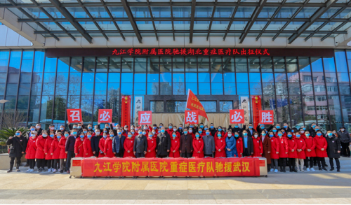 2月19日,在接到江西省卫健委支援湖北的紧急通知后,学校党委、行政高度重视,指示附属医院迅速行动,积极组建队伍、筹备物资。校党委书记赵伟、校长刘晓东、副校长杨耀防、纪委书记李广欣19日下午专程到附属医院现场部署、指导有关工作。医院广大医护人员纷纷请战,踊跃自愿报名。医院迅速组建了一支由重症医学科、呼吸科等医护人员组成的85人医疗团队。他们在简短的仪式后,随着一声“出征”号令,载着省卫健委、市委市政府、九江学院、市卫健委的殷殷嘱托,载着全市人民的牵挂与期望,紧急奔赴武汉抗疫最前线……