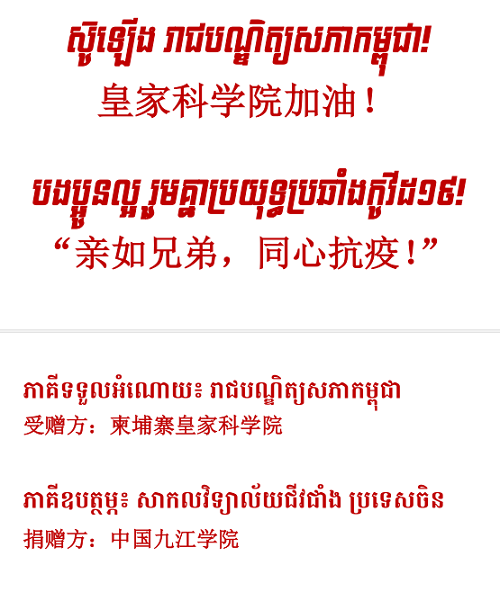 山川异域,风月同天。面对这场全人类的灾难,唯有团结协作才能够共克时艰,早日战胜疫情。疫情隔离了人与人之间的物理距离,却隔离不了九江学院与柬埔寨皇家科学院间的“大义与大爱”。相信风雨过后,团结合作的精神力量将激励双方勇毅前行。