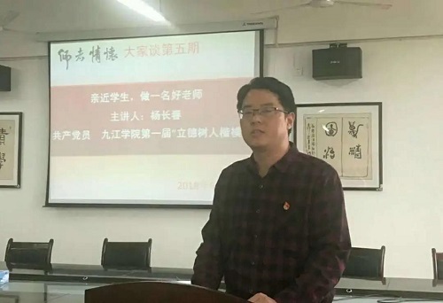 孙小明:开展师德漫谈系列讲座,是为了响应当时学校开展的校风建设深化年活动,针对学院青年教师比例大的特点而开展的一项特色活动。以此促进广大教师不断提高师德修养。讲座主要针对青年教师,利用周三下午全院集中的机会,每月一次,资深的老师也一起陪听。讲座每次围绕一个师德修养理念,讲十到二十分钟。教职工普遍反映效果不错。我们还邀请九江市6位知名书法家书写师德格言,装裱悬挂于学院各办公室、会议室,以激励教工自觉加强师德修养。
