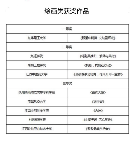 5月18日,第二届江西省高校图书馆超星杯“执手书香季 相伴花开时 致敬抗疫英雄”作品征集活动省级赛评审结果出炉。可喜的是,我校经校级赛选拔推荐的绘画作品《待到英雄归,繁华与共时》(作者:外国语学院 A1922班刘洋)和朗诵作品《背影,最美的逆行》(作者:文学与传媒学院A1851班任偲源)分别斩获绘画二等奖、朗诵二等奖两项大奖。全省共有50多所高校参赛,竞争激烈,佳作云集,整体评奖结果如下: