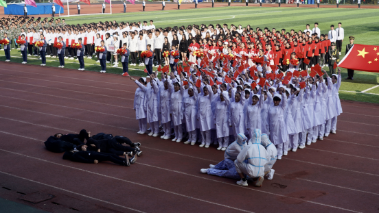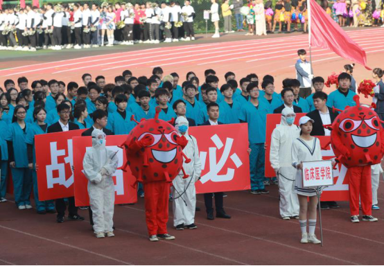 随后,鲜花队、彩旗队、裁判员方队和来自各学院和学校教职工的23个运动员方阵也踏着矫健的步伐依次入场。花球表演、啦啦操、扇子舞,旗语表演、纸板拼字表演……各二级学院将专业特色融入方阵入场表演,其中临床医学院、护理学院等学院以“致敬抗疫英雄”为主题的方阵表演成为本场开幕式的亮点。方阵表演中,时尚动感的音乐、青春曼妙的舞姿、铿锵响亮的口号,让人感受到了青春的力量、创造的激情;昂扬饱满的状态、勃发的英姿和别出心裁的方阵秀让现场的气氛瞬间热烈起来,掌声、欢呼声响彻云霄。