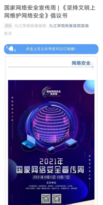 为营造网络安全文化氛围,线上九江学院官方微信公众号、官方微博QQ账号在网络安全宣传周期间开展网络安全进校园的宣传活动,组织江西省网络安全知识竞赛、发布防网络诈骗、注意个人网络信息安全等知识,得到广大同学的关注和积极参与;外国语学院学生会微信公众号及微博发布“加强网络安全,防范电信诈骗”推文,全院师生积极转发宣传,并参与江西省网络安全知识竞赛活动;文传学院发布推文宣传“国家网络安全宣传周”;附属医院通过公众号宣网络安全宣传周倡议书、宣教知识等。