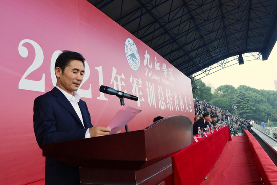 陈小林校长在致辞时指出,同学们高昂的士气、铿锵的口号、矫健的步伐和整齐的队列,充分展示了本次军训的成果。他代表学校向获得军训会操和内务评比优胜的单位表示祝贺,向九江军分区全体教官和学校退役复学的学生教官表示感谢。