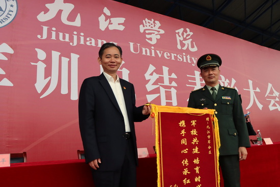 大会宣布了军训会操和内务评比结果,学校领导和九江军分区领导给获奖班级颁发了锦旗。