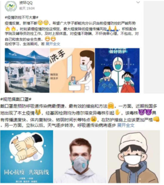 为做好防疫宣传工作,普及防疫科学知识,提升防控意识,让学院师生们以更加积极的心态应对疫情,校疫情防控领导小组办公室、学生处、校工会等部门分别发布了《关于疫情防控期间主校区校门实施临时管制的通知》、《致全体九江学院学子的疫情防控倡议书》、《关于暂停开放教职工活动中心的通知》等。