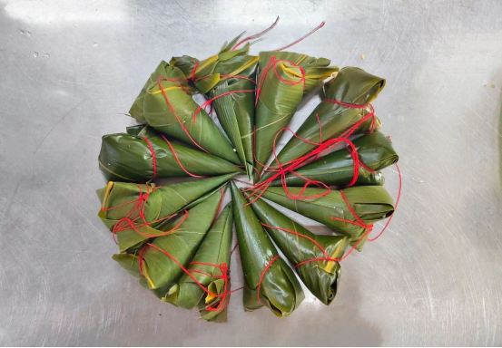 食堂阿姨更是“手把手”的传授如何包粽子,“粽子一定要包得紧实,做出来的才好吃。”食堂阿姨一边包一边叮嘱同学们。大家先将粽叶卷成漏斗状后,用筷子将馅料充实压紧,再用细绳一绕、一捆,一个个满怀情义的粽子很快就出现在面前。虽然大部分同学是第一次动手包粽子,包出来的粽子形态各异,并不“完美”,但现场其乐融融,充满着欢声笑语。