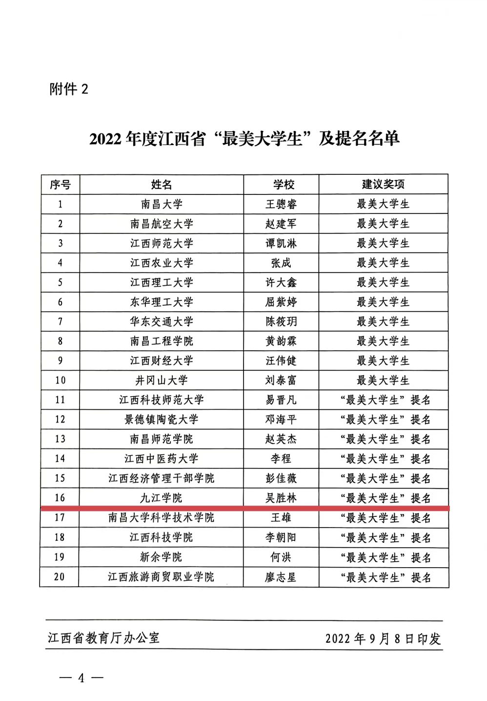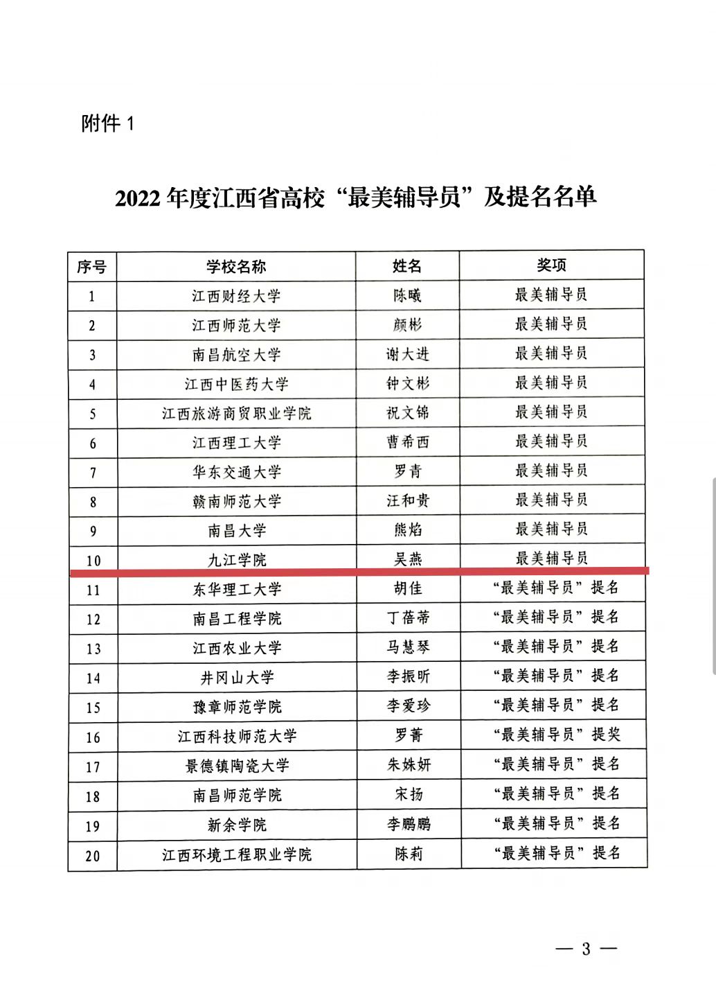 近日,中共江西省委宣传部、中共江西省委教育工委、江西省教育厅联合下发了《关于公布 2022 年度全省高校“最美辅导员”“最美大学生”推选活动结果的通知 》,我校教育学院吴燕老师荣获2022年度高校“最美辅导员”称号,管理学院18级本科生吴胜林同学荣获2022年度 “最美大学生”提名奖。