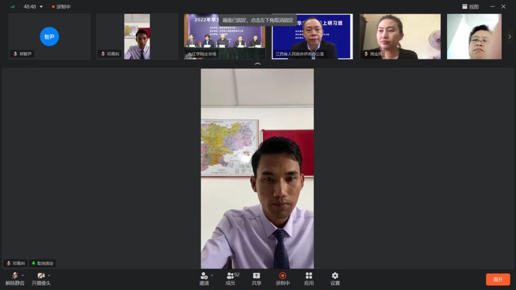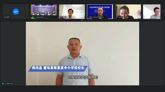 11月15日,由国务院侨办主办、江西省政府侨办承办、九江学院协办的“2022年华文教师线上研习班江西九江班”开班,来自缅甸、泰国、柬埔寨、马来西亚等国家的华文学校教师100余人在线参加研习。15日上午,开班仪式在我校逸夫图书馆报告厅举行。省政府侨办主任张继钦、市政府侨办主任曾建华,我校校长陈小林、副校长王万山和党委委员、统战部部长刘遵海以及100多名海外华文教师相聚云端,参加开班仪式。