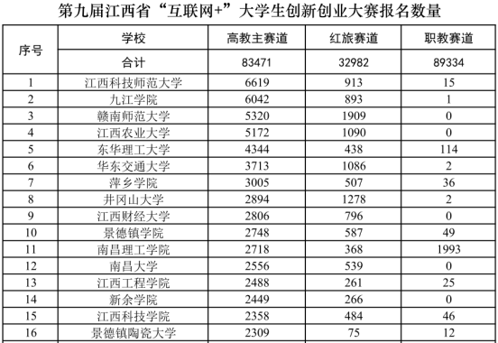 第九届九江学院“互联网+”大学生创新创业大赛启动以来,在学校领导的关心重视和各部门、各学院的大力支持下,全校师生热情高涨,掀起了“以赛促教、以赛促学、以赛促创、以赛育人”的新高潮,截至2023年6月16日17:00,省教育厅公布全国大学生创业服务网上我校成功申报的有效参赛项目6936项,累计参赛学生11588人,累计参赛学生人数26369人次,暂居全省第二。