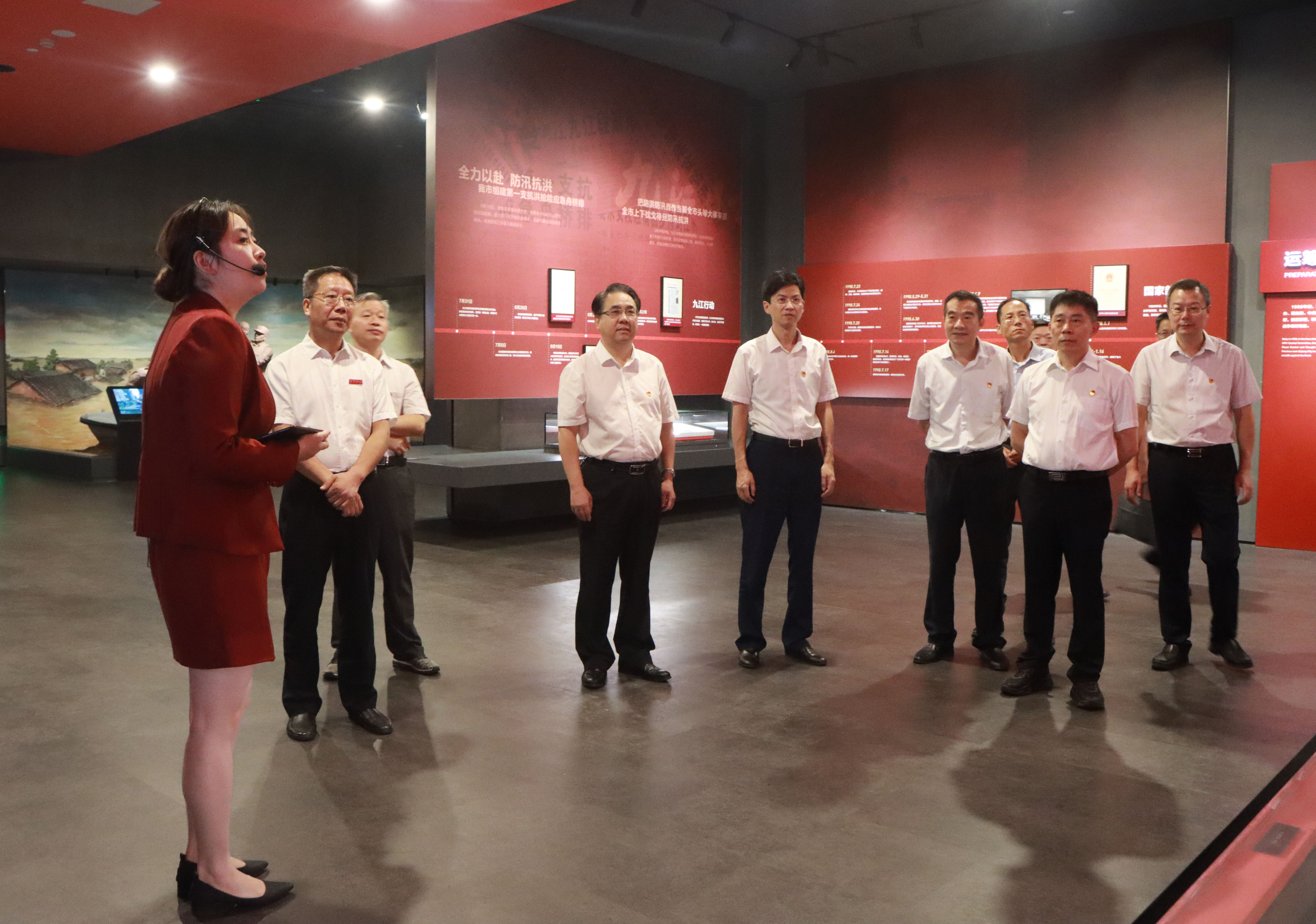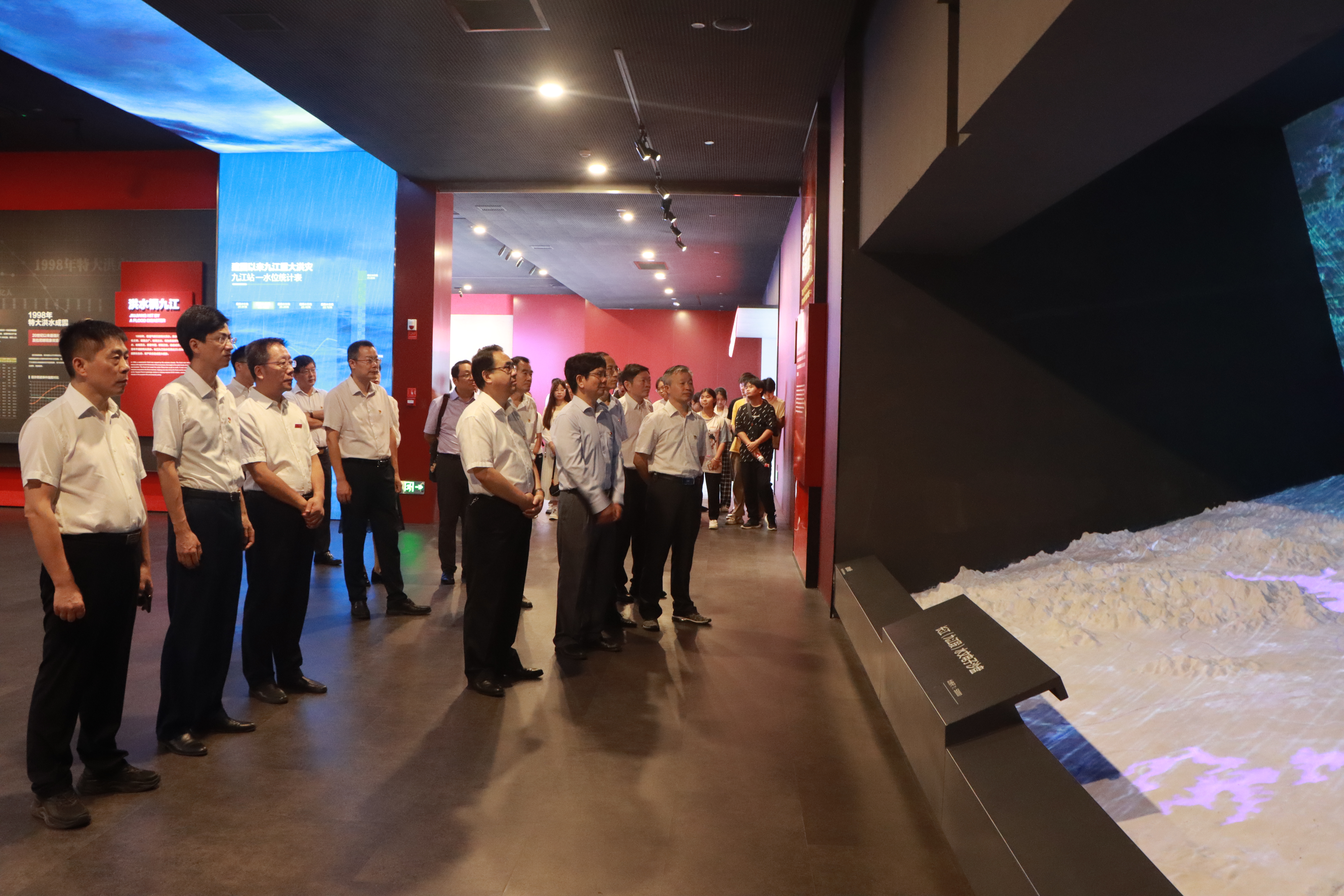 在展陈馆,讲解员带领与会成员重温了九江九八抗洪波澜壮阔的历史。展陈馆里陈列的文字、图片、视频和实物仿佛将时空拉回了25年前,再现了“万众一心、众志成城,不怕困难、顽强拼搏,坚韧不拔、敢于胜利”的伟大抗洪精神,让大家深切感悟当时广大军民在党的坚强领导下,舍生忘死、团结一心,抗击洪魔的伟大壮举,激励起大家“勇于担当、攻坚克难”的勇气、信心和决心。