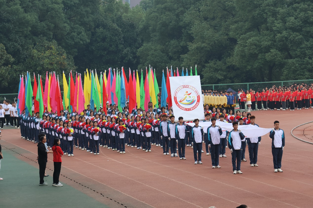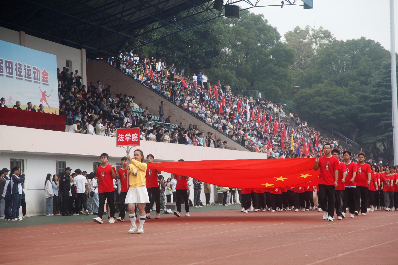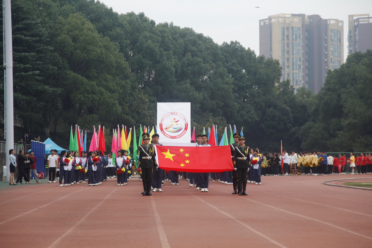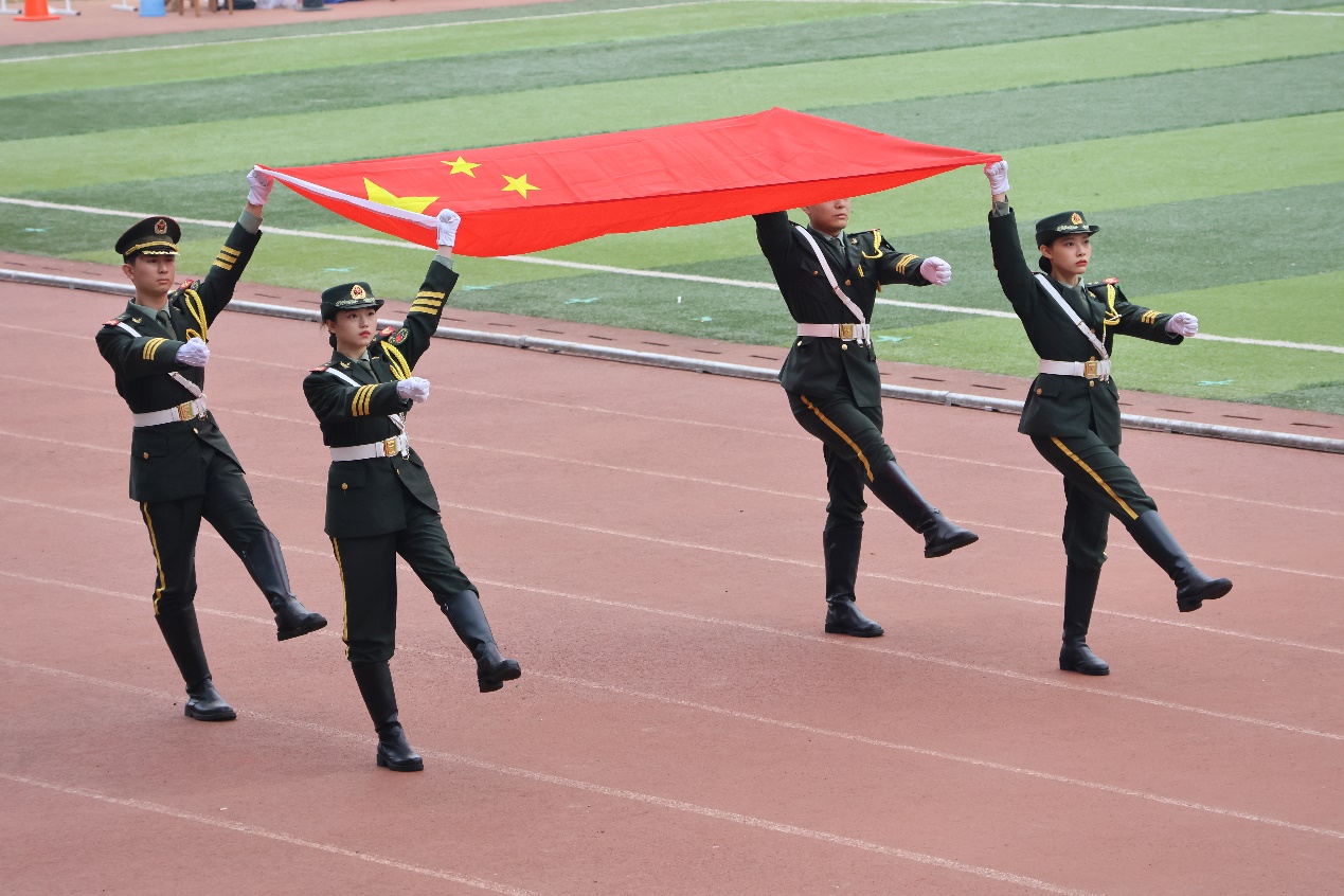 伴随着《运动员进行曲》铿锵有力的歌声,国旗、校旗、运动员会旗和会徽,以及鲜花队、彩旗队、各二级学院和教职工运动员组成的21个方阵队依次经过主席台。