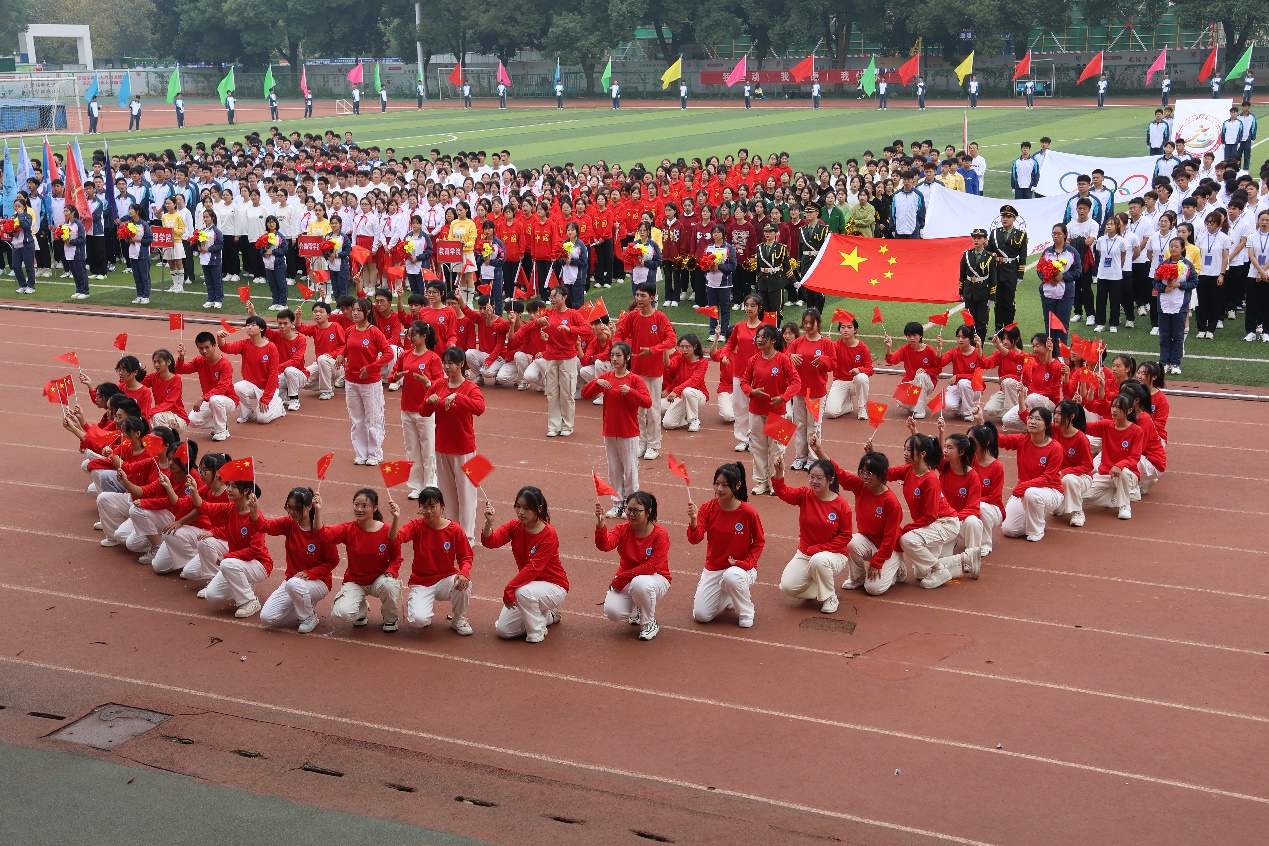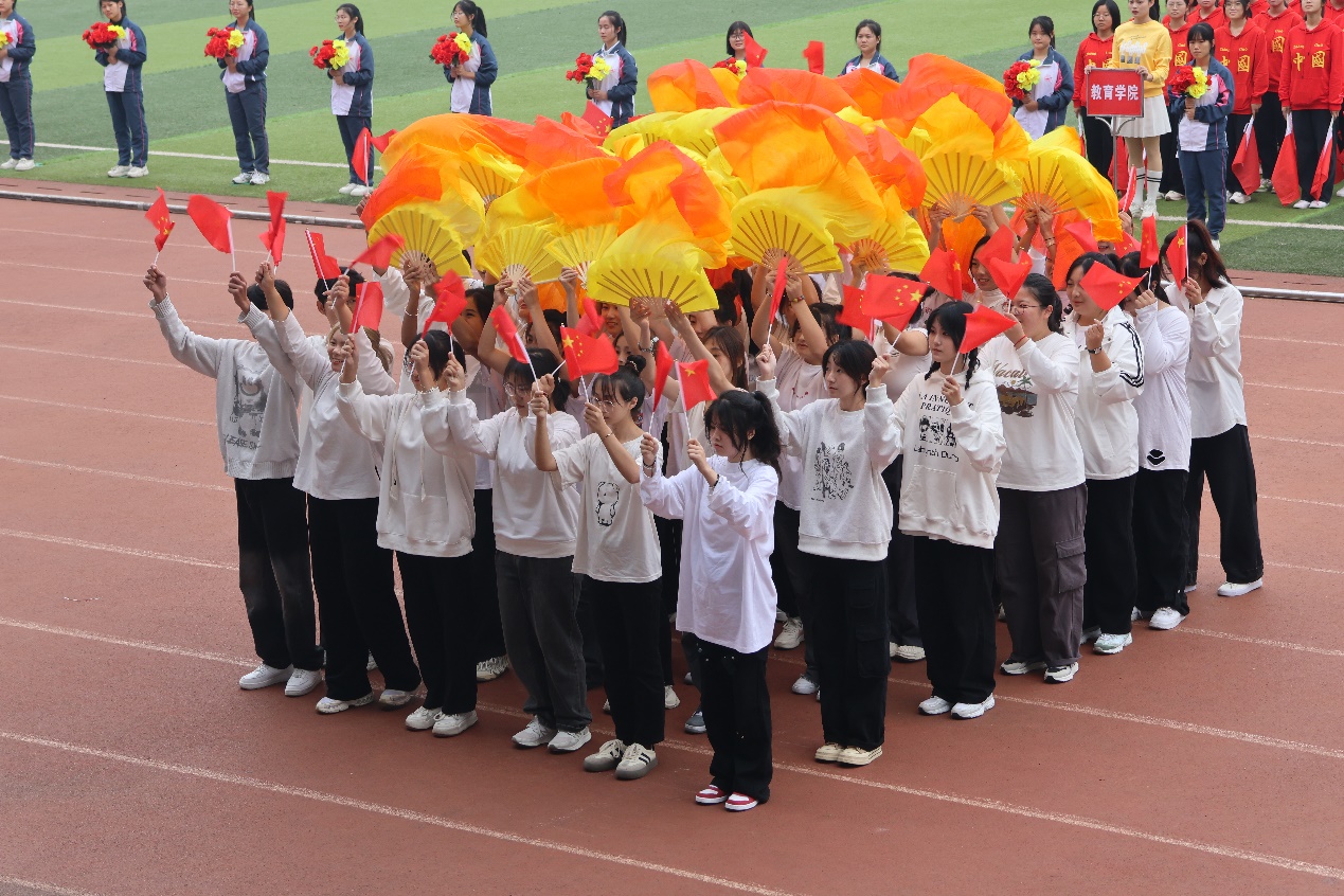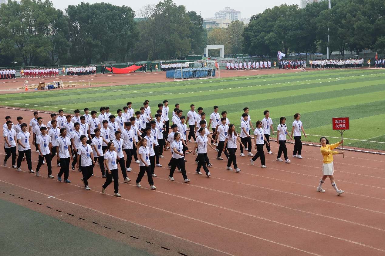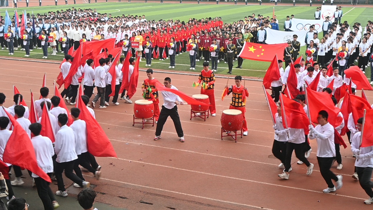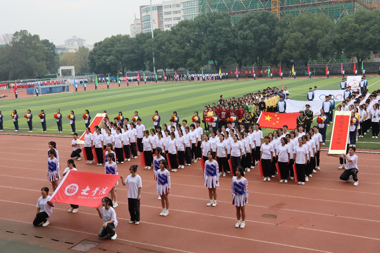 伴随着《运动员进行曲》铿锵有力的歌声,国旗、校旗、运动员会旗和会徽,以及鲜花队、彩旗队、各二级学院和教职工运动员组成的21个方阵队依次经过主席台。