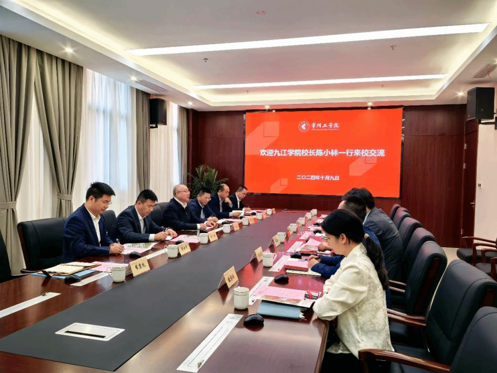 在常州工学院考察交流期间,常州工学院校长张兵、副校长苍玉权等领导热情接待了陈小林一行,在交流座谈会上,张兵热情回顾了今年上半年到九江学院作专题报告的愉快经历,介绍了常州工学院的办学情况,重点介绍了学校在学术研究、国家级项目立项、产教融合特色等方面的情况。
