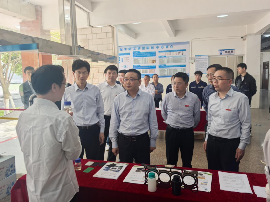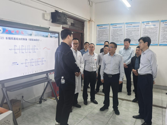 在化工实验楼,黄强实地考察江西省重点现代产业学院——有机硅新材料产业学院及能源循环校企联合创新实验室的建设与运行情况,详细了解产业学院建设成效及产学合作科研成果,并听取校企合作中的实际困难。他充分肯定了我校在有机硅新材料产业学院建设方面取得的成绩,并鼓励进一步推动政校企深度融合,充分发挥现代产业学院在重点产业链高质量发展中的关键作用,为企业精准输送产业技术人才,解决关键技术问题,为高标准高质量建设长江经济带重要节点城市发展提供更强有力的人才和科技支撑。