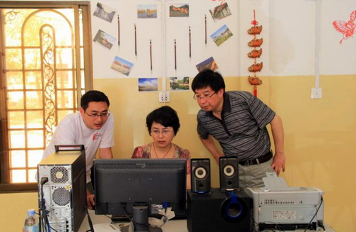 陈先平、宋春玲在肖荣老师的陪同下,来到吴哥高中孔子课堂。肖荣老师向来访嘉宾介绍了孔子课堂的有关情况,并对嘉宾的到来表示热烈欢迎。陈先平对吴哥高中孔子课堂的热情接待表示感谢。接着,宋春玲向大家详细了介绍了九江学院电子图书馆的使用方式方法及其他一些技术性问题。