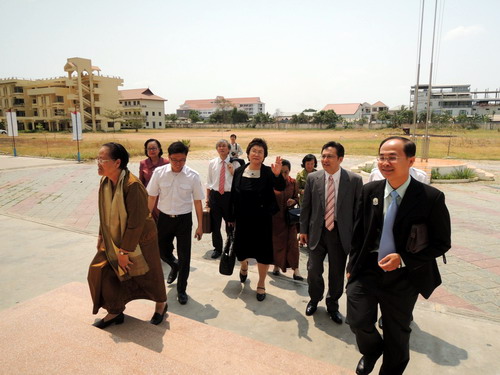 3月16日,日本关西外国语大学理事长谷本榮子在关西外国语大学孔子学院院长靳卫卫教授及事务局长吉川佳孝的陪同下,访问柬埔寨王家研究院孔子学院。柬埔寨王家研究院院长、孔子学院理事长克罗提达(Khlot Thyda)院士、孔子学院院长谢莫尼勒(Chea Munyrith)、中方院长帅式毅、汉语教师志愿者及孔子学院官员班学员热情迎接。