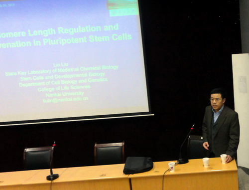 报告中,刘林教授近年来其课题组对端粒体长度与衰老的关系、多能性干细胞端粒体长度和稳态的表观遗传调控、诱导调控多能干细胞技术/体细胞核移植技术对端粒体的修复与再生的研究成果进行详细介绍,并对端粒体修复技术在修复卵巢衰老、抗肿瘤及部分提前衰老疾病的应用前景进行了展望。报告后,刘林教授与参会的教师和学生进行互动交流。