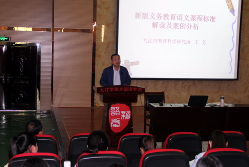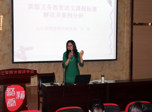 2016年江西省中小学教师资格考试的报名工作已经启动,为使同学们对新版义务教育语文课程标准有整体的掌握,对教师资格考试的面试环节有清晰的了解,同时为进一步加强我校承担语文教育专业授课的教师在课程设计方面与义务教育阶段语文教学之间的衔接,4月19日下午,九江市教育科学研究所语文教研员王芳应邀作客由教务处师范教育科和教师发展中心联合主办的九江学院第八期名师论坛活动,做了题为《新版义务教育语文课程标准解读及案例分析》的讲座,来自文传学院的教师代表、13级汉语言文学专业、14级语文教育专业全体学生共计两百余人聆听了讲座,活动由文传学院副院长周子渊主持。