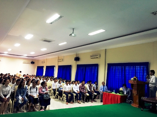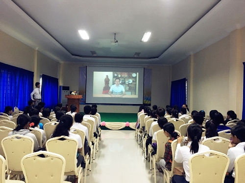 开班典礼上,赛萨恩代表学校致辞并欢迎新生入学,并播放了两段视频来了解柬埔寨王家研究院孔子学院的建设及发展,接下来汉语教师蔡钦又以PPT的形式介绍柬埔寨王家研究院孔子学院马德望国际大学汉语中心的建设及发展,并教学生学习日常中文交际用语。