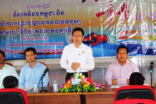谢莫尼勒阁下在宣讲会上作了题为“‘一带一路’——语言先行”的主题演讲。他向出席的学生介绍了孔子学院的情况,他指出,特本克蒙省韩桑林大学汉语中心是孔子学院在第9个省开办的第30个汉语教学点。他还重点推介了汉语水平考试(HSK,HSKK)的情况。他介绍说,汉语水平考试是留学中国的通行证,是申请留华奖学金、夏令营的必备要求,通过考试可以在柬埔寨的中资公司、企业就较容易找了一份好的工作。他和同学们一起回顾了中柬千年友好的历程,中柬两国从公元一世纪开始交往,三国吴国就派了使者到柬埔寨,中国元朝使者周达观写就的《真腊风土记》记录了吴哥时代的繁荣,西哈努克国王和中国领导了建立了深厚的友谊,随着“一带一路”项目建设的逐步开展,对懂中文人才的需求量会越来越大,学好汉语,将会有一个好的前景。
