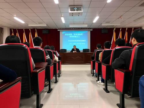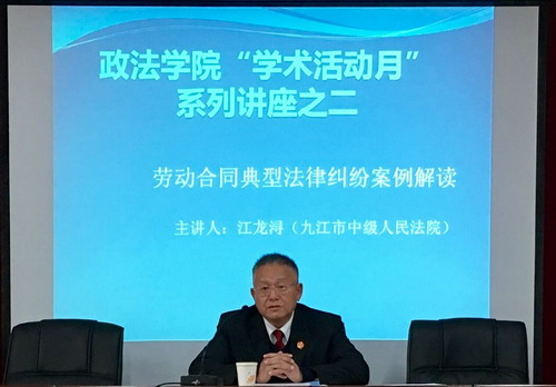 为进一步浓厚精准研习法律案例的氛围,激发学生对法律实务案件研习的兴趣,11月17日下午,政法学院举办了“学术活动月”第二场学术讲座,题目为“劳动纠纷典型法律案例解读”,主讲人为九江市中级人民法院民三庭专门从事劳动纠纷审判业务的资深法官江龙浔,政法学院部分没课老师和高年级法学本科专业的学生聆听了讲座,讲座由政法学院副院长曹钟安主持。