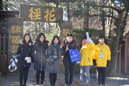 12月8日,“2016年海外华裔青少年‘中国寻根之旅’冬令营——庐山冰雪营的庐山行,正式开始了旅程。来自马来西亚、印度尼西亚、泰国的共87名营员及领队老师一同乘着观光车,沿着盘山公路一路向上,亲身感受到了毛泽东《七律·登庐山》中描写的“一山飞峙大江边,跃上葱茏四百旋。”庐山以雄、奇、险、秀闻名于世,具有极高的科学价值和旅游观赏价值,素有“匡庐奇秀甲天下”之美誉。如琴湖,因其湖面似小提琴而得名。日从东出,水波潋滟,扑面而来的清风捎带着冬日的凉意。接着往下走,便是唐代诗人白居易的《大林寺桃花》一诗,造就的一处名胜——花径。景白亭、花径亭、紫荆亭、白居易草堂…“人间四月芳菲尽,山寺桃花始盛开。”带着这样的意境,营员们都不禁齐声吟出这句诗。