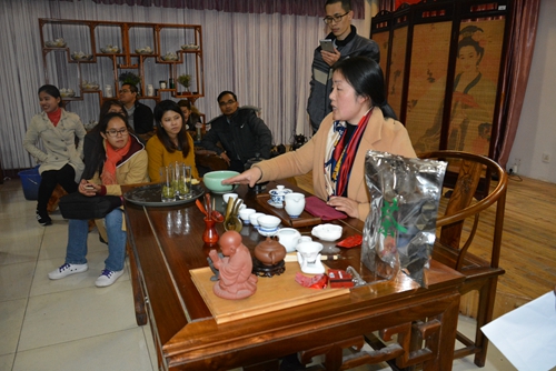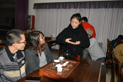 下午,旅游学院的杨婵容老师为体验团成员们带来一堂别开生面的中国茶艺课。杨老师简单的为大家讲解了中国的茶道文化、茶艺的相关礼仪,并向大家展示了中国的茶艺。经过老师详细的讲解和示范之后,大家两人一组,开始尝试动手泡茶,复习之前老师教授的动作和步骤。课程结束后,杨老师为表现优异的成员赠送了紫砂壶和茶叶,并鼓励大家回去后多多动手尝试。