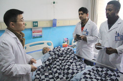 帅式毅一行在临床医学院/附属医院张志平院长的带领下检查了留学生临床带教情况,在消化内科的教学查房过程中,童明富主治医师熟练地运用英语给几位外籍留学生讲述该名患者的病情、诊断、治疗以及手术操作。讲学过程中,几位留学生听得聚精会神,时而若有所思,时而提出疑问,整个过程严谨、流畅、高效。童明富医生为了提高外籍留学生汉语水平,部分讲学刻意使用双语表达,减慢语速,耐心讲解直到他们完全理解。讲学结束后,外籍留学生们表示临床医学院/附属医院医生英语水平程度高,双语教学深得他们欢迎。