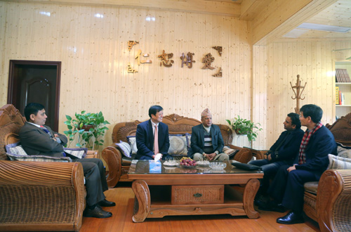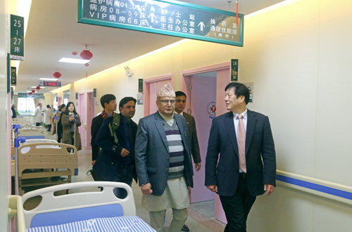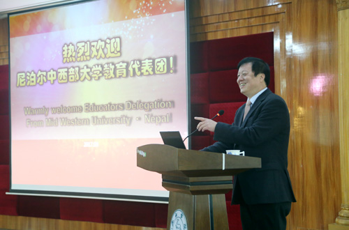 上午8:30,临床医学院/附属医院举行了隆重的欢迎仪式,该院端庄的礼仪小姐给外宾们献上了鲜花,Upendra校长一行给附院领导献上了象征友谊的羊毛围巾。在行政办公楼九楼会议室,外宾们观看了该院的宣传片。张志平院长作了热情洋溢的致辞,张院长对各位远道而来的客人表示热烈欢迎,并简要介绍了附院的历史渊源及发展现状。张院长说,尼泊尔是世界三大宗教之一佛教的发源地,是我国的友好邻邦。临床医学院/附属医院有11名尼泊尔留学生在这里进行临床医学实习,我们尽量为其提供良好的学习和生活环境,希望他们早日学有所成。希望通过此次交流,我们进一步加深沟通交流,增进彼此友谊,拓宽合作渠道,实现共同发展,推动我们的教育事业更上一层楼。