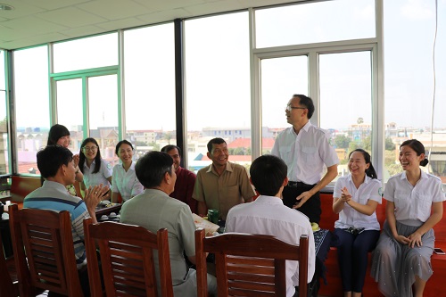 双方在柬埔寨王家研究院孔子学院茶文化室进行了友好会谈和交流。夏修龙院长对桑皮先生和宋春龙先生的到访表示热烈的欢迎,感谢柬埔寨国家语言文字委员会为在柬工作的中方教师教授柬语和柬埔寨文化。他说,此次活动主要是为了让大家了解中国茶文化,他希望此次文化交流可以增强老师们之间的交流。