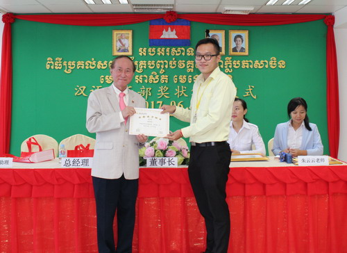 方侨生董事长(Pu Khear Se)在颁奖仪式中致辞,他指出,中国政府推行的“一带一路”政策将惠及柬埔寨的发展。纵观柬埔寨和加华银行的发展历史,加华银行离不开中文人才,中文教育对加华银行非常重要。随后,方董事长为柬埔寨孔子学院及在此任课的邢慧莹、朱云云两位老师颁发了证书和奖品,以此感谢柬埔寨孔子学院对加华银行中文教学的大力支持,并感谢两位老师的辛勤工作,他希望和柬埔寨孔子学院保持长期合作。
