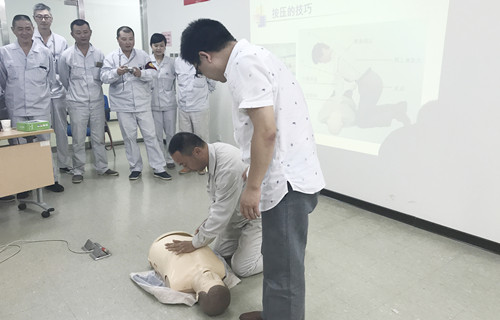讲座从心肺复苏和常见急诊救治两方面进行讲解。曹学峰医生利用PPT对心肺复苏的意义及步骤进行解析说明,并利用模拟人现场教学,让参加讲座的员工们直观地了解如何进行心肺复苏,员工们纷纷主动上前学习,体验急救过程。讲座还重点对窒息、触电、溺水、中暑以及针对大唐化工企业常见的外伤处理等内容进行了深入浅出的讲授。