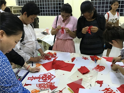 本次活动一共分为两个场地,活动A区由8位志愿者教师负责,伴随着中国传统民乐“茉莉花”的歌声,8位志愿者教师开始了旗袍秀,向孔子课堂的学生展示了中国传统服饰之美;紧接着是蒙古族舞蹈“小骑手”,欢快的音乐搭配着志愿者教师的舞步展现了中国传统舞蹈之美;活动B区则是由其他6位志愿者教师负责的中国传统才艺的展示,戴小享老师向学生展示了中国的汉字之美,学生在老师的指导下积极尝试;蔡燕燕老师则带领学生一起学习剪纸,学生对此表示了极大的兴趣并完成了“春”“福”字;而李陆芮老师则是带领学生诵读论语经典,感受中华古典文化。
