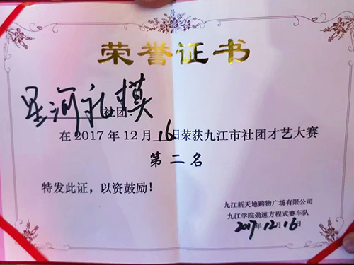 12月16日,由九江市新天地购物广场有限公司主办、九江学院劲速方程式赛车队协办的九江市社团才艺大赛在新天地购物广场举办,艺术学院星河联合会礼仪模特队荣获第二名。