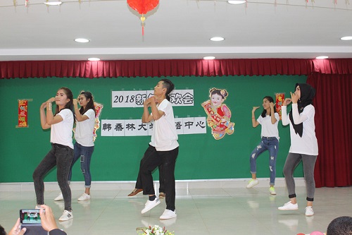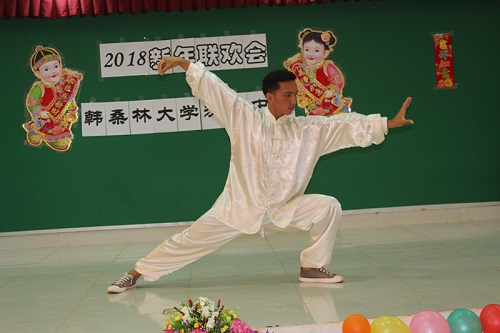 本次新年联欢活动节目多样,互动性强。一支中国经典的广场舞《小苹果》掀开了本次新年活动的帷幕,也燃起了喜悦热闹的气氛。柬埔寨学生表演的中国传统舞蹈《小骑手》展现了大草原的豪迈气势,让现场师生体会到了独特的中国美。学生们带来的经典中文歌曲《茉莉花》、《朋友》、《新年好》、《我们的明天》等让在座的领导和师生感受到了中国的美妙音乐以及两国人民的友好。师生合唱的歌曲《瀚宇之花盛开的地方》让现场师生感受到了所有在异国他乡为汉语教育事业付出青春和时间的汉语教师的志愿者精神,两位在场的汉语教师志愿者感动不已。大二学生沈荣毅(Sakroony)和中文老师表演的太极拳和太极扇赢得了现场观众的阵阵热烈掌声,也点燃了一些学生们的中国功夫梦。