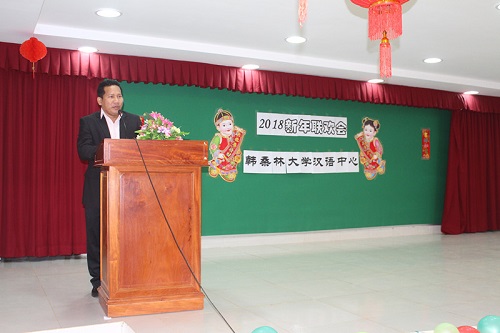 活动开始,韩桑林大学院长品万那罗(H.E. PIN )Vannaro)致辞,他对全体师生的到来表示热烈欢迎,并感谢柬埔寨王家研究院孔子学院对韩桑林大学汉语教学的支持与帮助。同时,他肯定了本校两位汉语教师志愿者的辛勤努力。他说:“中国老师春节期间虽然不能回国,但是希望老师们能在柬埔寨找到过新年的温暖。”品万那罗校长鼓励韩桑林大学的学生们努力学好汉语,为自己的未来增添一双腾飞的翅膀。最后,他为全体师生送上了诚挚的新年祝福。