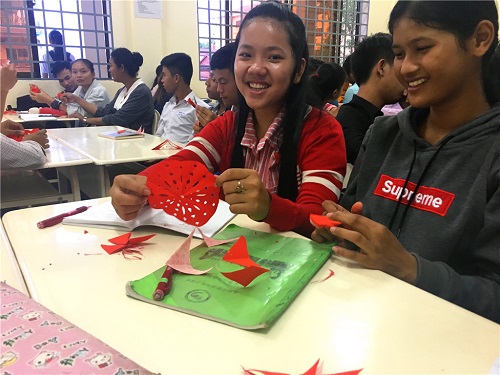活动后,学生李丽莎(LEE SAR)说:通过此次活动,我认识到现代生活环境的美好,学习了中国传统文化,我们应该珍惜现在,好好学习。学生苏何亚(SOU HOUYAA)则表示要将自己的剪纸作品送给她的妈妈,以感谢妈妈的辛劳付出。(曾春梅/文叶鑫/摄)