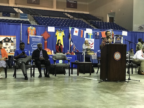 活动期间,萨凡纳州立大学校长多齐尔博士(Dr. Dozier)、副校长兰尼博士(Dr.Laney)以及大学法律顾问达文女士(Ms. Devine)等校领导先后来到孔子学院的展台前,与孔院教师亲切交谈,称赞孔院的展台布置别具匠心,并充分肯定了孔子学院教师为广大师生及社区民众提供高质量的汉语课程及文化推介活动所付出的努力。