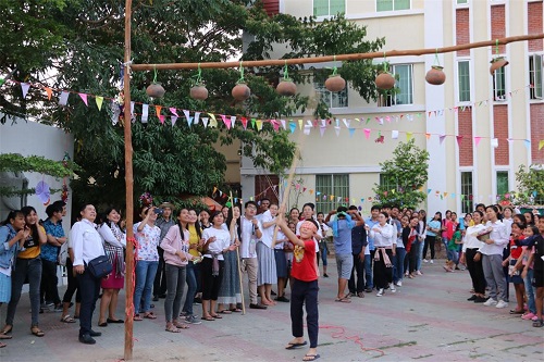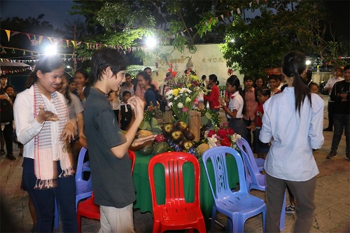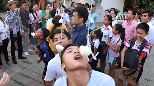 下午4点,激动人心的拔河比赛拉开了本次新年游戏活动的序幕,参加拔河的老师们使尽浑身力气,观众加油呐喊声震耳欲聋。接着是精心设计的柬埔寨的传统游戏丢安坤、藏水布、吃地瓜、打陶罐等节目,吸引了众多师生。围成一个大圈子的藏水布游戏,在追赶嬉闹中充满欢声笑语。蒙眼打陶罐的游戏前排满了长队,学生们轮流被蒙上眼睛用竹竿去敲打高高挂起的陶罐,陶罐里有各色各样的奖品,倘若学生们能用竹竿打碎陶罐,那么就可以获得里面的奖品与奖金。激动期待的排队学生,兴奋呼喊的裁判,形成孔院操场一道精彩的风景,操场上的欢呼声此起彼伏。在游戏结束之后,进行了抽奖活动,来自晚上3B班的潘淑丽(PHAN SOKLY)同学抽得了一等奖,获得孔子学院一学期的全额奖学金。抽奖环节过后,还有很多同学和老师在操场上一起跳起了柬埔寨舞蹈,大家意犹未尽。
