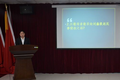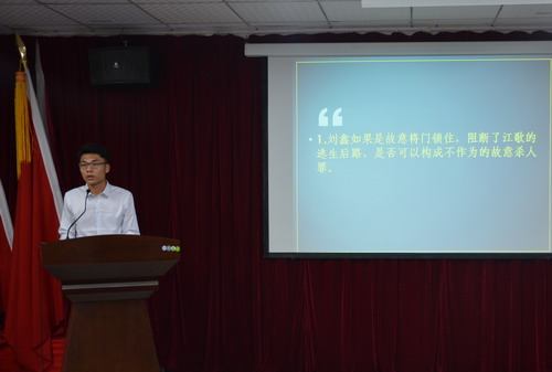 活动以小动画形式再现江歌遇害情景,让在场嘉宾更直观的了解案情,随后学生代表发言,A1711班钟斌、余奕萱、邹子萱、B1741班周重伟分别对案件的不作为犯罪、侵权责任、惩罚等方面提出问题并发表自身见解。几位同学发言有理有据,思路清晰,让在场嘉宾及教授深感欣慰。接下来的老师评析更是让人获益匪浅,首先是李仲文老师从民事角度为案件作讲解,李老师提出无因管理、见义勇为的观点,来指明刘鑫与江歌的行为,两者是否构成法律关系、构成侵权及负义务的问题。王志学老师则是在法律逻辑、法律思维、法律语言方面对案件作讲解,他指出作为法律人应具有法律思维,在解决案情上首先要罗列可能情况,再进行排除,并建议以事实、证据为前提得出结果,精彩的讲解与善意的提议使在场人员感触颇深。最后刘闻博士就案件具有争议的问题进行深入剖析,着重在在江母对刘鑫是否构成侵权问题上以事实与观点的区别说明江母对刘鑫隐私权的侵犯。