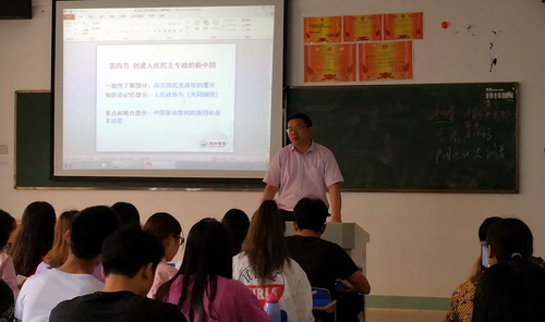 全体参加人员首先在竞秀楼102教室听取吴保春博士为电商A1643班讲授的《中国近现代史纲要》课程,讲授内容为“创建人民民主专政的新中国”。随后,大家围绕吴保春博士的授课,从不同的角度进行了广泛讨论,大家一致认为,吴保春老师具有博士学位和博士后研究经历,具有较高的学术水平和科研能力,为教学提供了坚实的基础,吴博士的授课重点突出、层次分明、教学方法得当,教学效果良好。大家同时也提出了一些意见和建议。