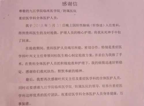 患者因“发现肝癌2月余,腹泻、发热1周,加重伴意识障碍8小时”入临床医学院/附属医院ICU抢救,入院时病情危重,呈昏迷状态。通过科主任叶兴文及主治医生刘松等医护人员的连夜全力抢救,患者于第二天苏醒过来。经过重症医学科全体医务人员半个月的精心治疗和护理,患者的病情得到了好转和稳定,顺利出院。为了表达对叶主任及刘医生精湛医术的赞赏和对全体护士细心护理的感激之情,患者送来感谢信与锦旗,称赞他们医术精湛,护理专业。