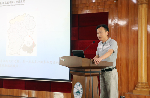 副院长黄啸林从九江及九江学院概况、临床医学院/附属医院概况及历史沿革、医院管理、医疗服务、医院教学工作、学科建设发展和员工生活等方面生动详细地为大家进行了介绍,他结合近期工作情况就医院发展予以阐述,并对新入职员工提出了殷切希望。