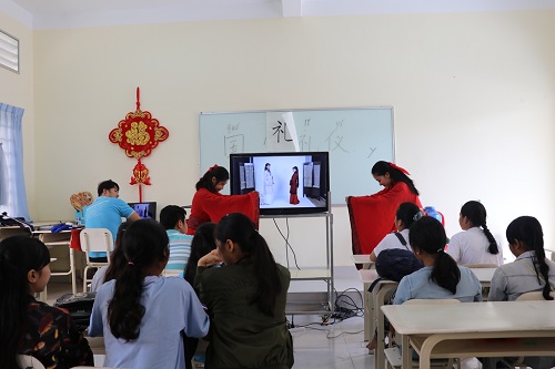 10月20日下午,暹粒吴哥高中孔子课堂为学生们准备了汉服礼仪课堂展示。王叶豪老师给学生们播放了汉服相关视频,并介绍了汉服的构成、发展历史等基本情况。随后,叶鑫老师、曾一舫老师向学生们展示汉服的基本礼仪,包括万福礼、拱手礼、士相见礼等。展示完毕后,学生们兴致勃勃地穿上汉服,亲身体验汉服礼仪,并纷纷表示这样的活动很有意思,希望以后能够再次参加。