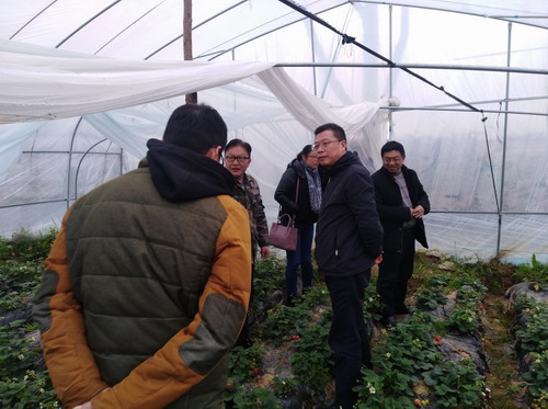 在芙蓉村第一书记李然,芙蓉村支部书记胡德森,市教育局驻村扶贫干部查览等引领下,梅龙宝一行来到芙蓉村扶梦专业种养合作社,察看合作社草莓种植和稻虾养殖情况,详细询问合作模式、种养技术和销售推广途径等。