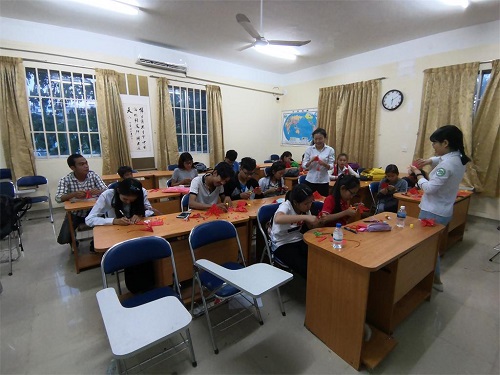 中华文化活动一定少不了剪纸课,文亚老师带领初级C班上了一节异彩纷呈的手工剪纸课。一张普通的红纸在老师的巧手中很快成了一个立体的春字,学生们都被魔术般的变换震撼了,急切的想知道每一步该怎么剪,“老师,你慢一点儿!”“老师,这个怎么弄?帮帮我。”二十多个人的课堂到后来三个老师都忙不过来。钟慧琪老师举着第一个学生的作品兴奋的跟其他老师一起分享。透过剪纸的镂空,看到了最美的的笑容。
