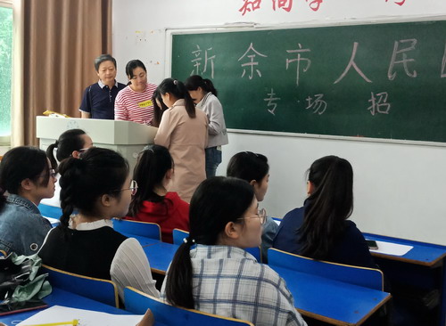 九院代有才人出,勇闯面试独木桥。为推进2019届毕业生就业工作再上新台阶,进一步提高2019届毕业生就业率,5月15日下午13点,护理学院携手新余市人民医院在思贤楼205、206教室开展专场招聘会。此次招聘会深受医院和护理学院重视,学生科科长范玲玲和辅导员袁青兰老师在现场组织和指导,共有62名准毕业生参加招聘。